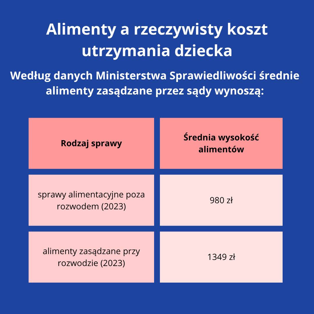 Najbardziej uporządkowane oficjalne dane o wysokości alimentów zasądzanych przez sądy pochodzą z zasobu danych publicznych Ministerstwa Sprawiedliwości. Z tego zasobu wynika, że w sprawach o alimenty i ich zmianę poza alimentami orzeczonymi przy rozwodzie średnia wysokość zasądzonych alimentów na rzecz dzieci wynosiła 829,9 zł w 2021 r., 906,8 zł w 2022 r. i 980,1 zł w 2023 r. W przypadku alimentów zasądzanych na rzecz dzieci w wyrokach rozwodowych średnie były wyższe i wynosiły odpowiednio 1079,0 zł w 2021 r., 1217,3 zł w 2022 r. i 1349,8 zł w 2023 r.